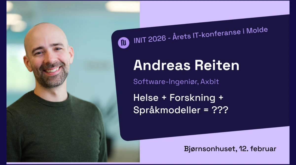 Andreas Reiten er sivilingeniør fra NTNU med bakgrunn i nanoteknologi, og jobber med programmering, kunstig intelligens og datavisualisering. På INIT 2026 presenterer han et forskningsprosjekt ledet av overlege og mikrobiolog Einar Nilsen i samarbeid med Axbit, der språkmodeller brukes til å trekke ut strukturerte data fra historiske pasientjournaler. Målet er å redusere en tidkrevende flaskehals i klinisk forskning og åpne for flere og mer effektive studier.