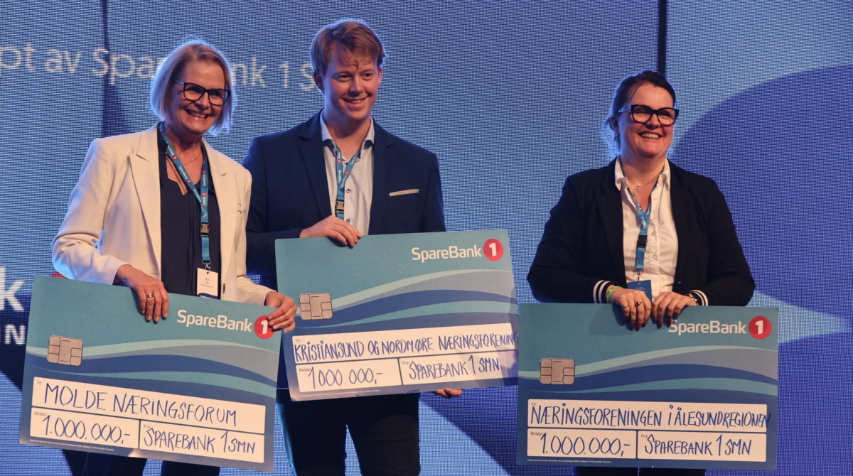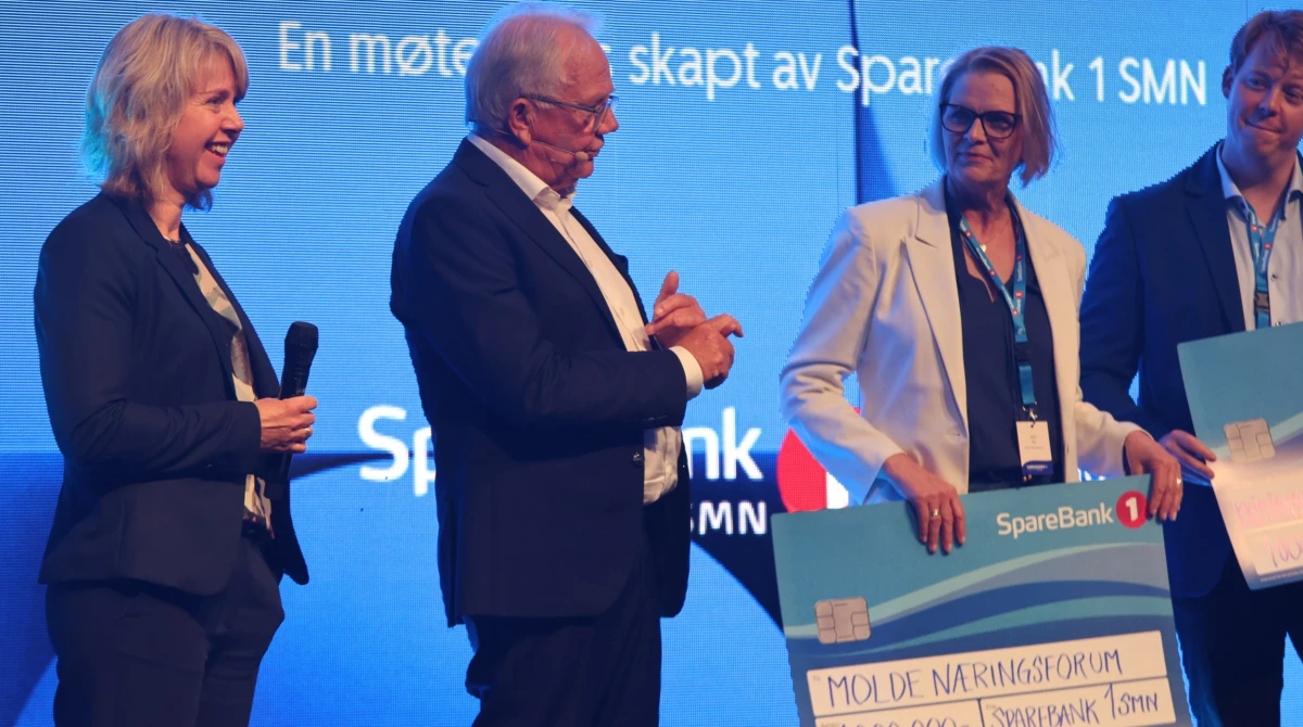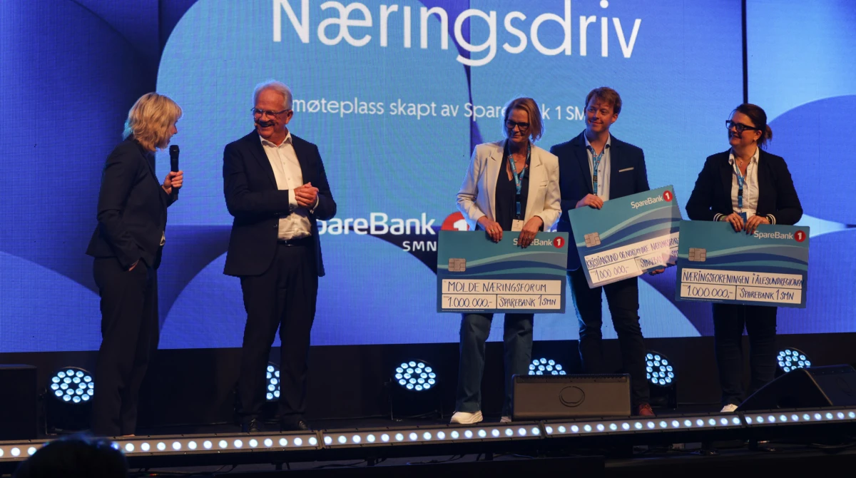 Under Næringsdriv tidligere i år delte SpareBank 1 SMN ut én million kroner – til hver av næringsforeningene i Molde, Ålesund og Kristiansund. Midlene skal styrke omdømmebygging og rekrutteringsarbeid i regionen.På scenen sto regionbanksjef, næringsliv Karin Norli og banksjef Jan Rune Hurlen fra SpareBank 1 SMN sammen med Britt Flo, daglig leder i Molde Næringsforum, Snorre Grytli, prosjektleder i Kristiansund og Nordmøre Næringsforening, og Heidi Nakken, administrerende direktør i Næringsforeningen i Ålesundsregionen.